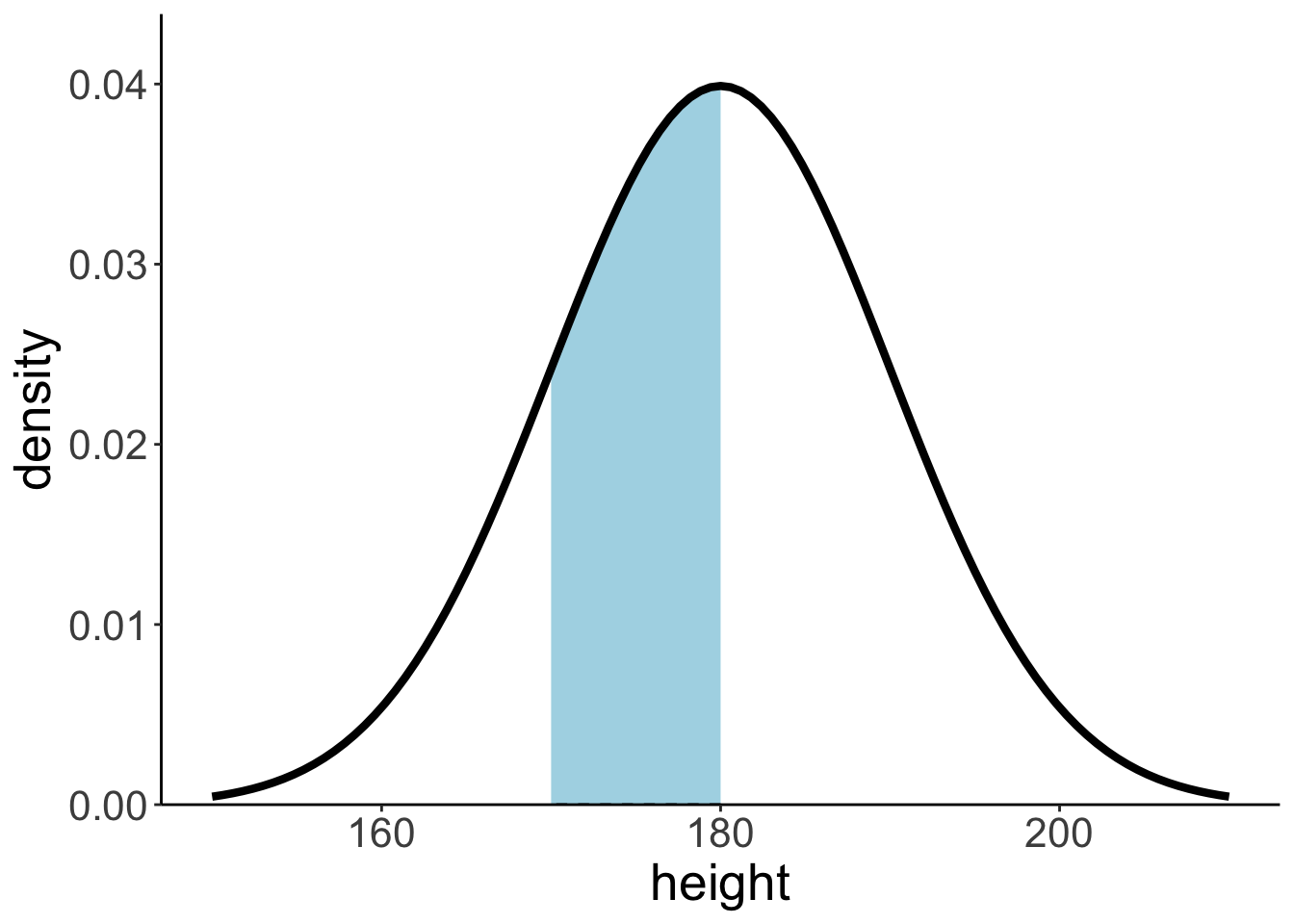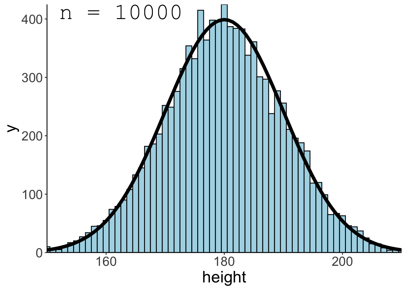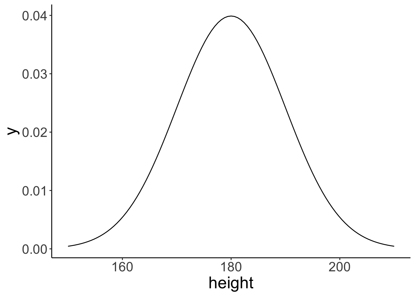Note that the data frame I created with tibble() only needs to have the minimum and the maximum value of the x-range that we are interested in. Here, I chose 150 and 210 as the minimum and maximum, respectively (which is the mean +/- 3 standard deviations).