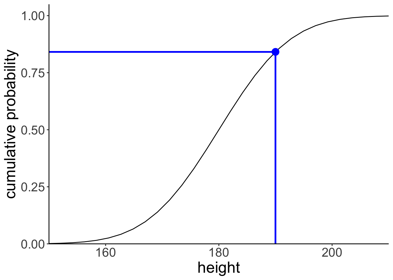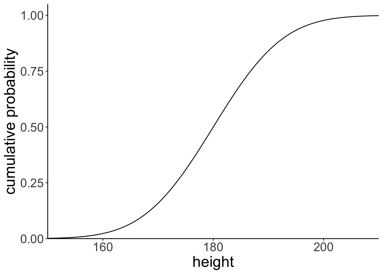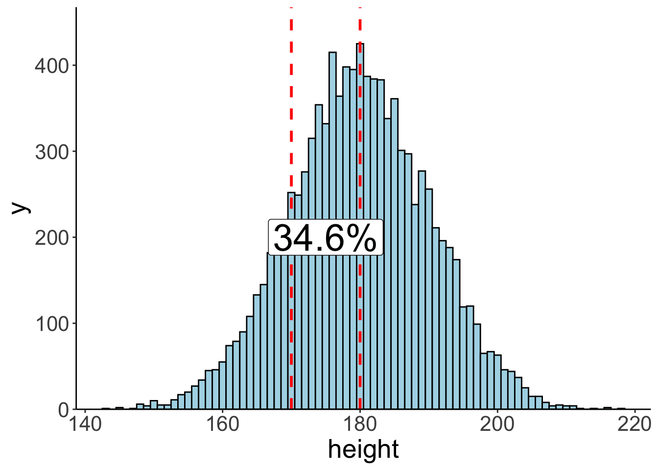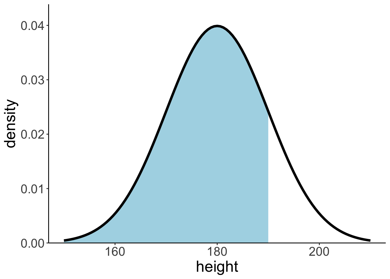 Note that the data frame I created with tibble() only needs to have the minimum and the maximum value of the x-range that we are interested in. Here, I chose 150 and 210 as the minimum and maximum, respectively (which is the mean +/- 3 standard deviations).