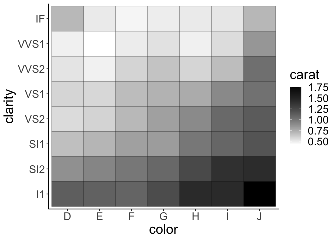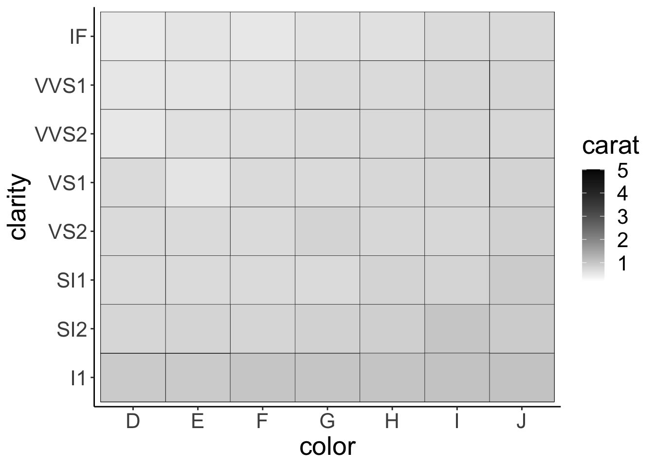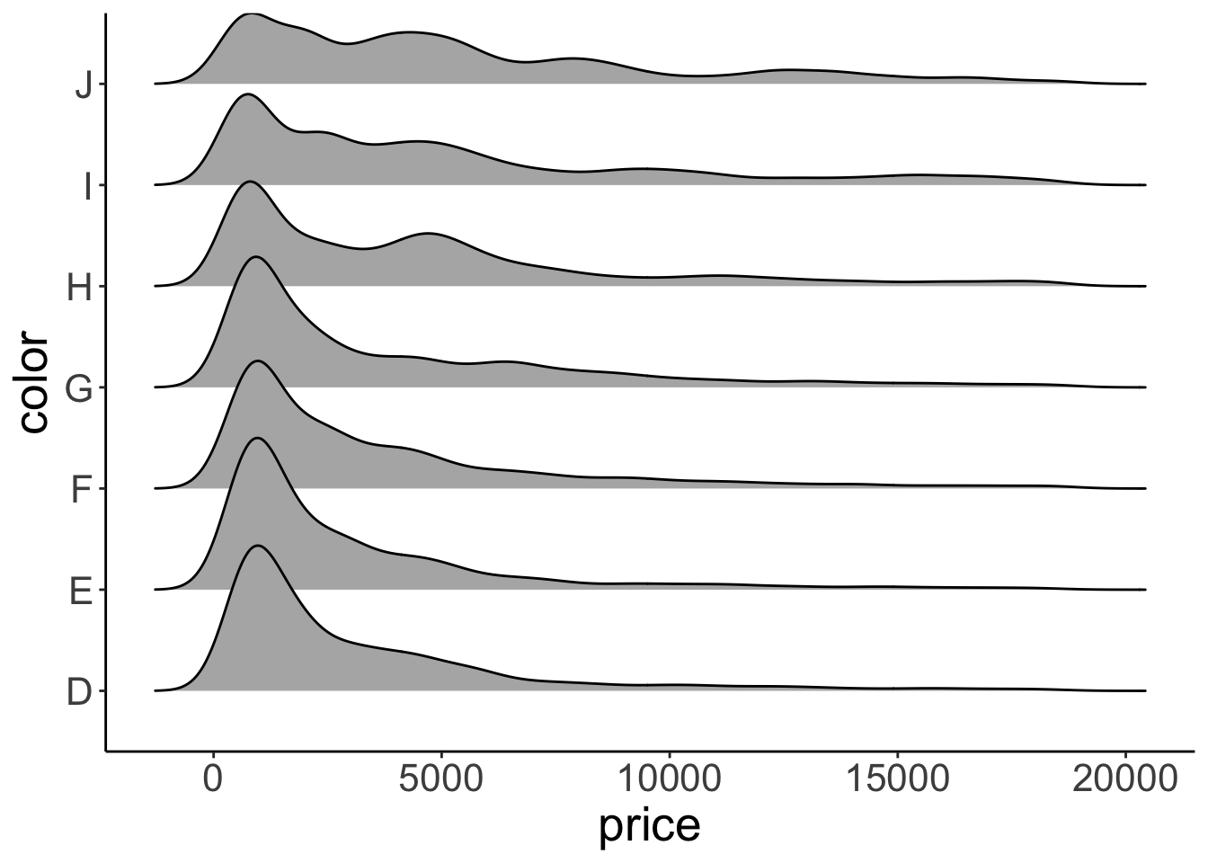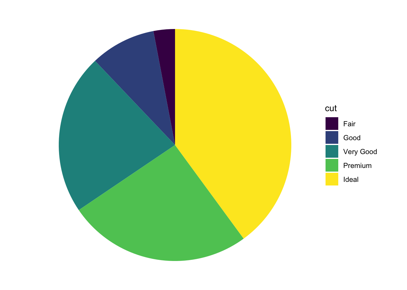 This bar chart shows for the different cuts (x-axis), the number of diamonds of different color. Stacked bar charts give a good general impression of the data. However, it’s difficult to precisely compare different proportions.