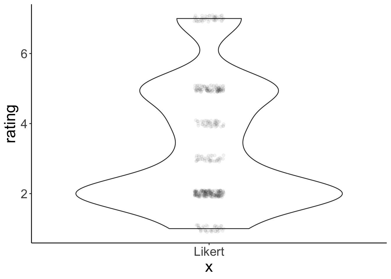 Violin plots don’t work well for Likert-scale data (e.g. ratings on a discrete scale from 1 to 7). Here is a simple example: